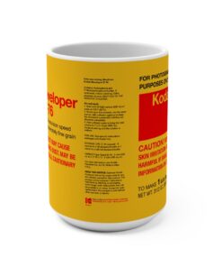 Bright, nostalgic, and a little bit lab-technical — this 15oz ceramic mug wears a vintage film-developer label like a badge of honor. The bold yellow background and red Kodak D-76 graphics call back to darkroom rituals: measured agitation, the smell of chemistry, and the quiet focus of prints coming to life. It’s made for mornings when you’re plotting your next shoot, cleaning negatives, or sinking into a creative routine. The large C-handle feels steady in hand while the generous capacity holds an extra pour of coffee, tea, or the drink that fuels your work. This mug looks at home on a cluttered workbench, beside a stack of contact sheets, or tucked into a camera bag on the way to a shoot — it speaks to people who love analog process and the stories behind each frame.