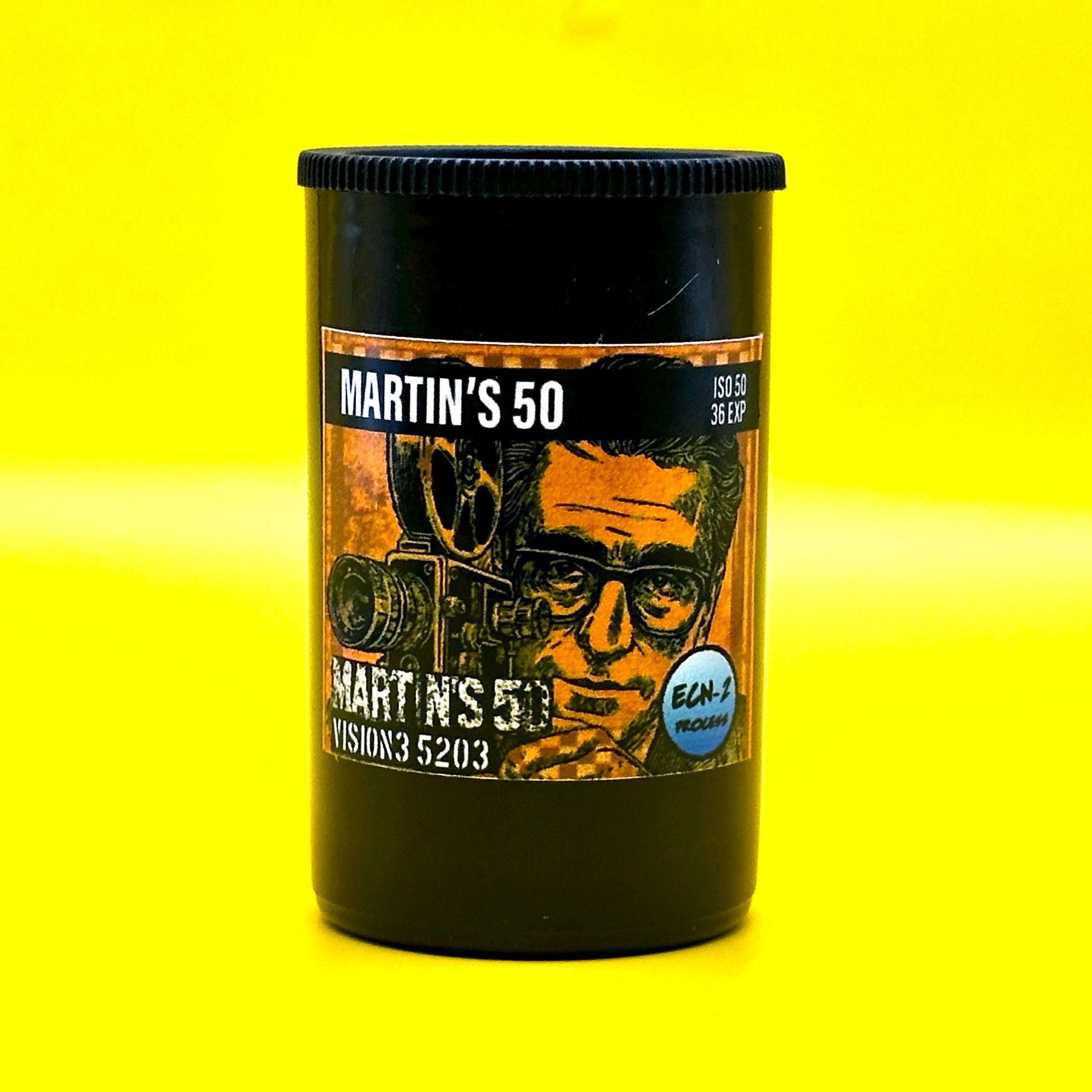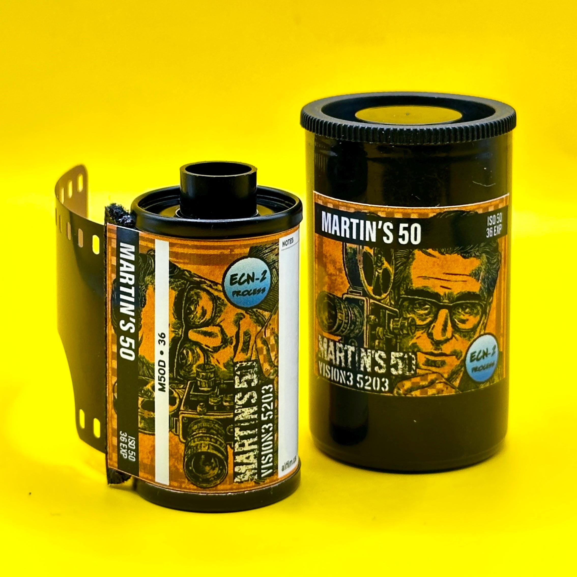 Martin’s 50 is a respooled Kodak Vision3 5203 film, a daylight-balanced motion picture stock originally rated at ISO 50 and designed for maximum color accuracy, ultra-fine grain, and wide dynamic range. This is Kodak’s most modern 50D cinema film, widely used in professional productions and now made available for still photographers.