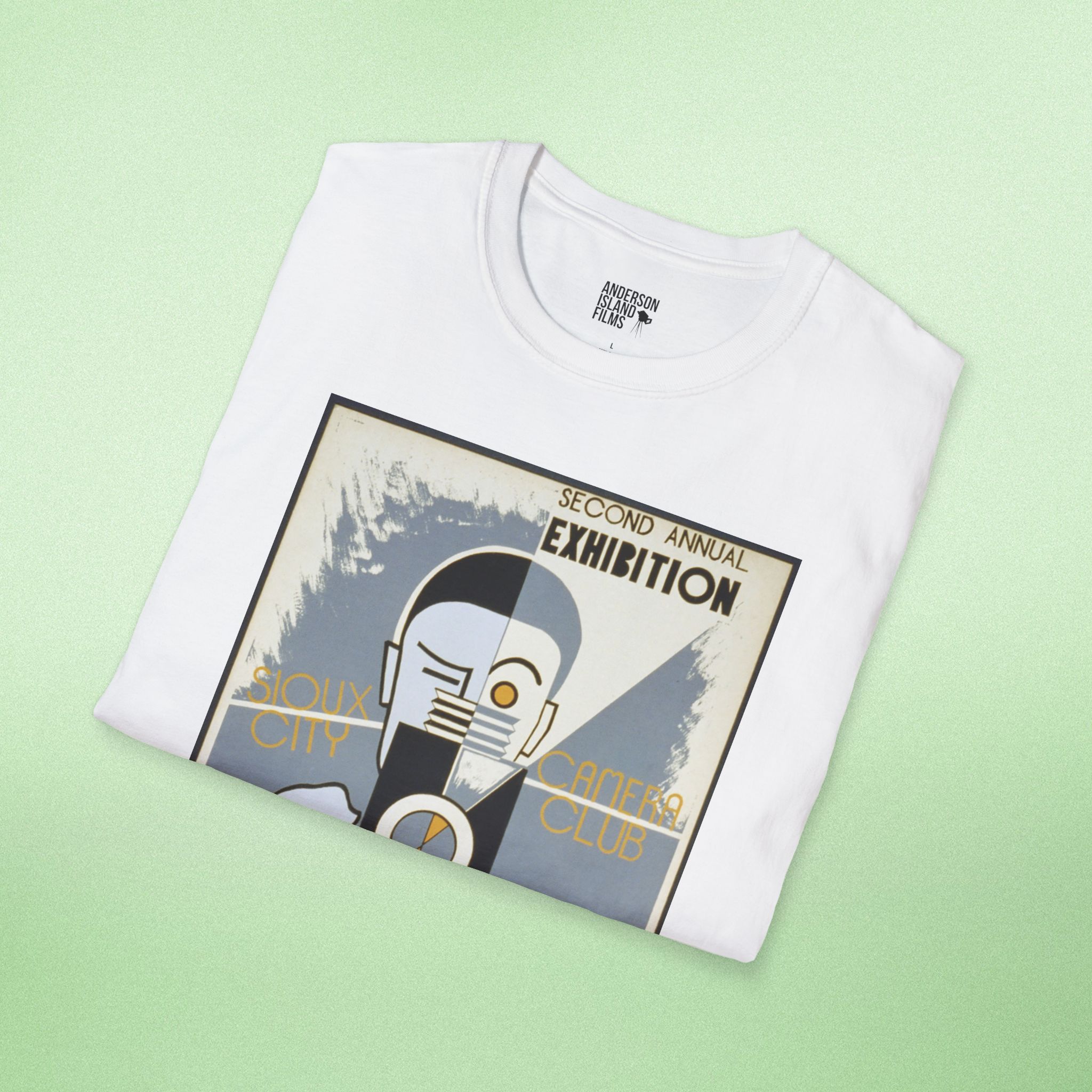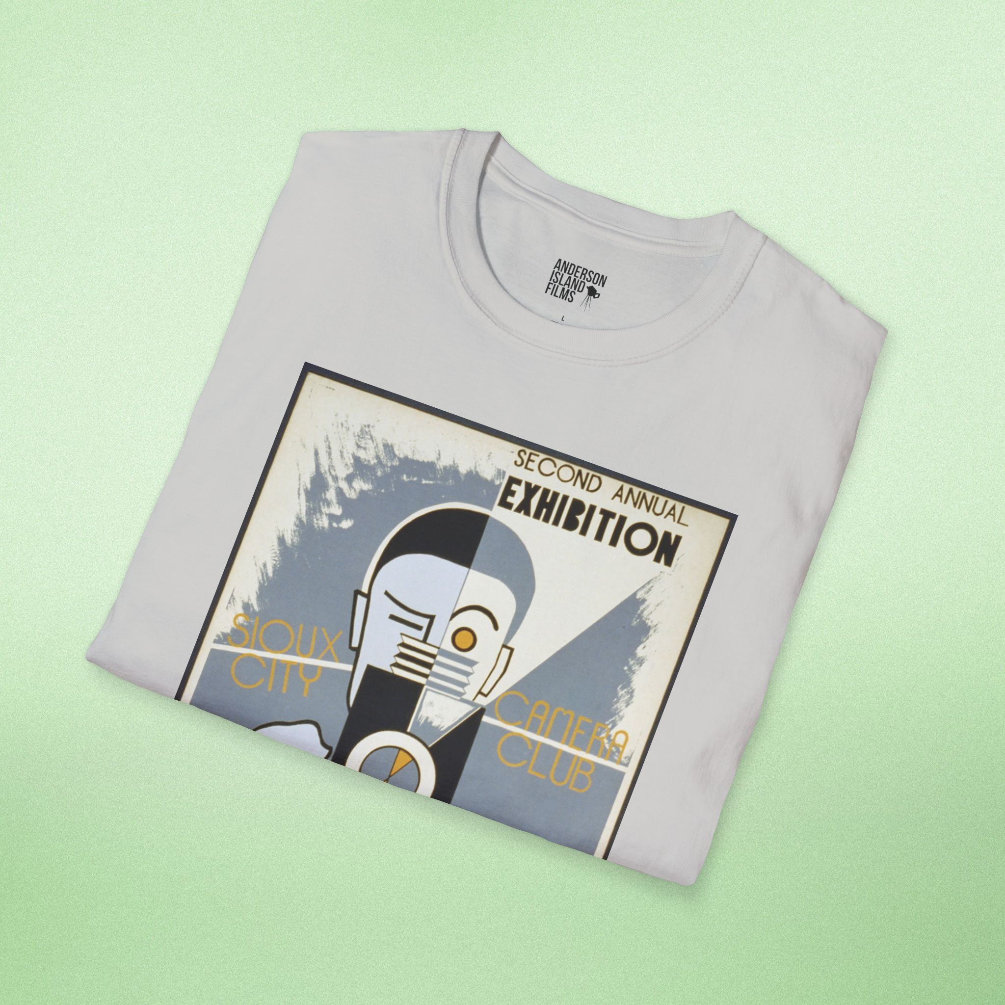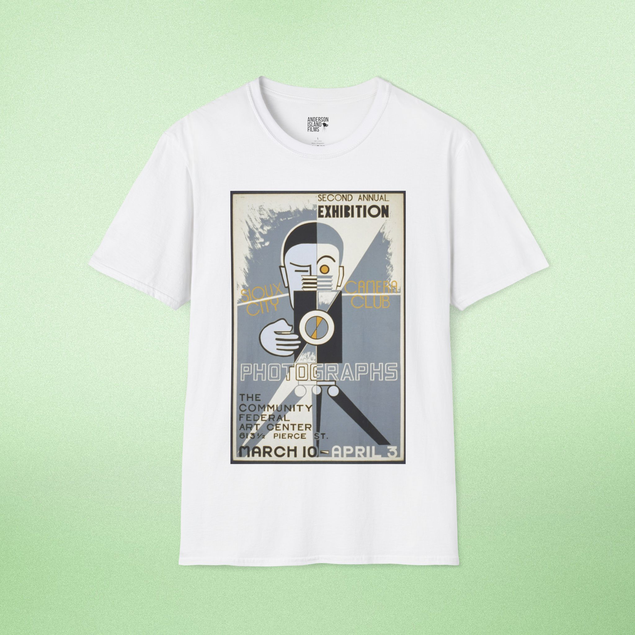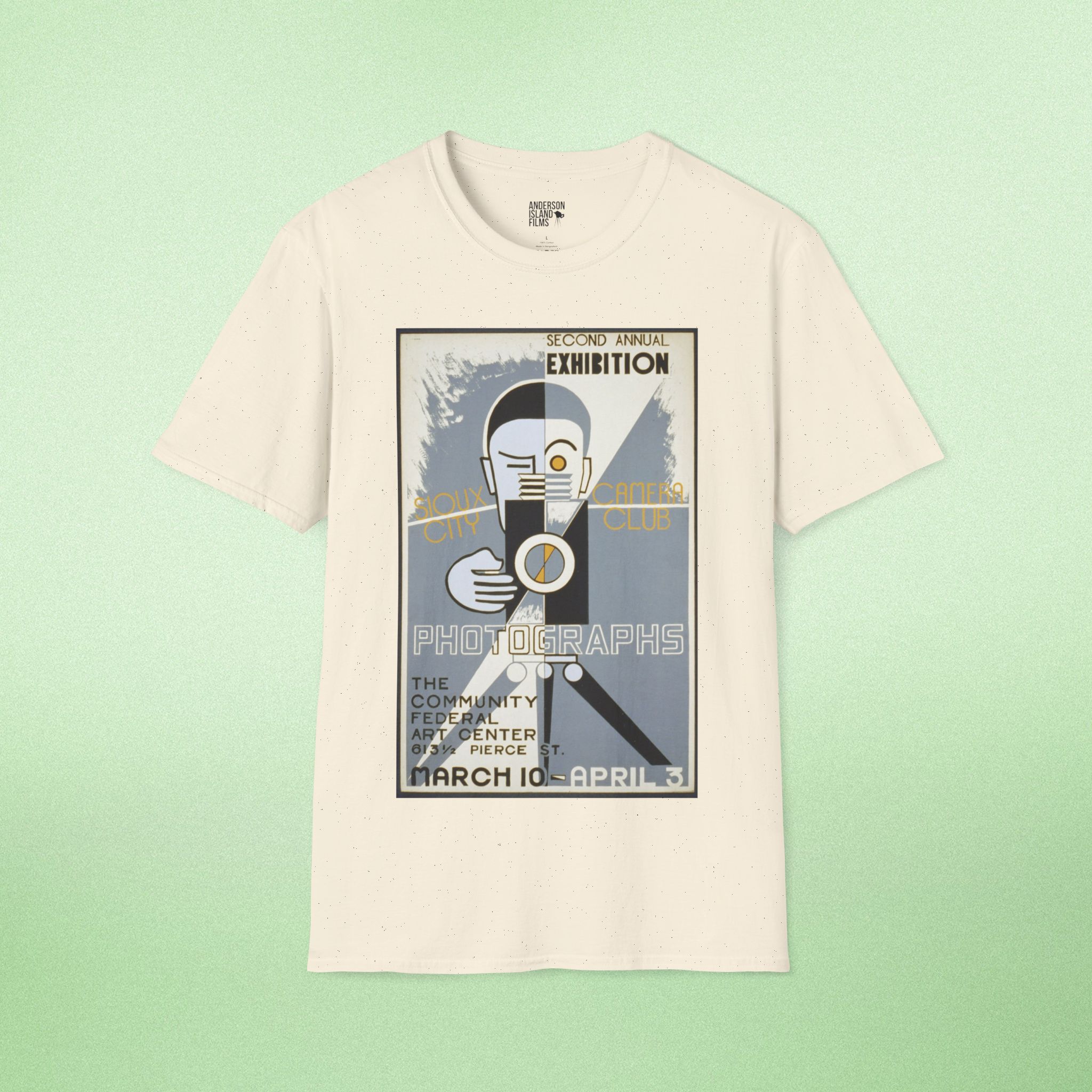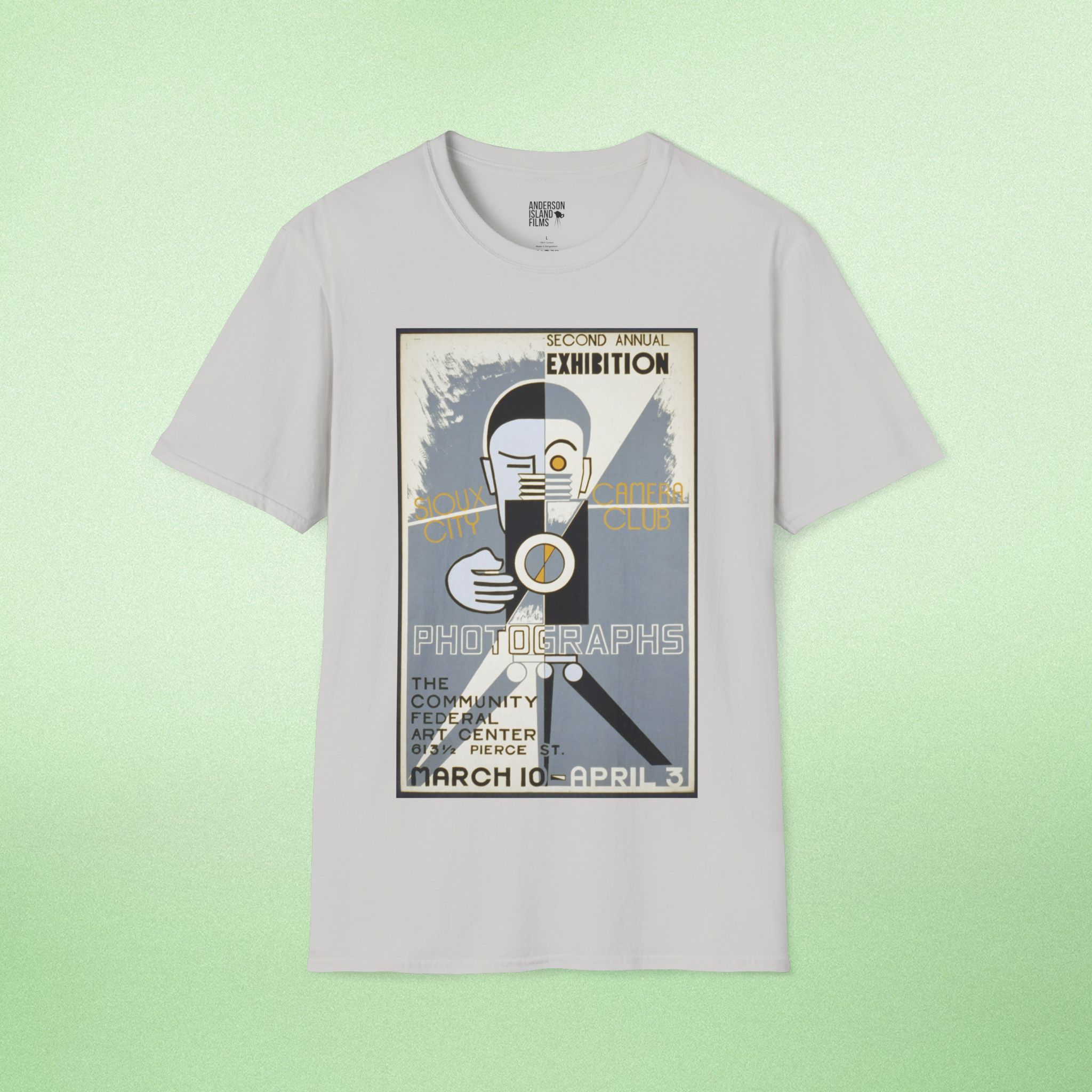 Celebrate the golden age of photography with our vintage-inspired T-shirt featuring a reproduction of the iconic poster from the Sioux City Camera Club’s second annual exhibition. This design, originally created between 1936 and 1939 by the Federal Art Project, showcases a stylized man at a camera, capturing the spirit of early 20th-century photography and art exhibitions in Sioux City, Iowa.